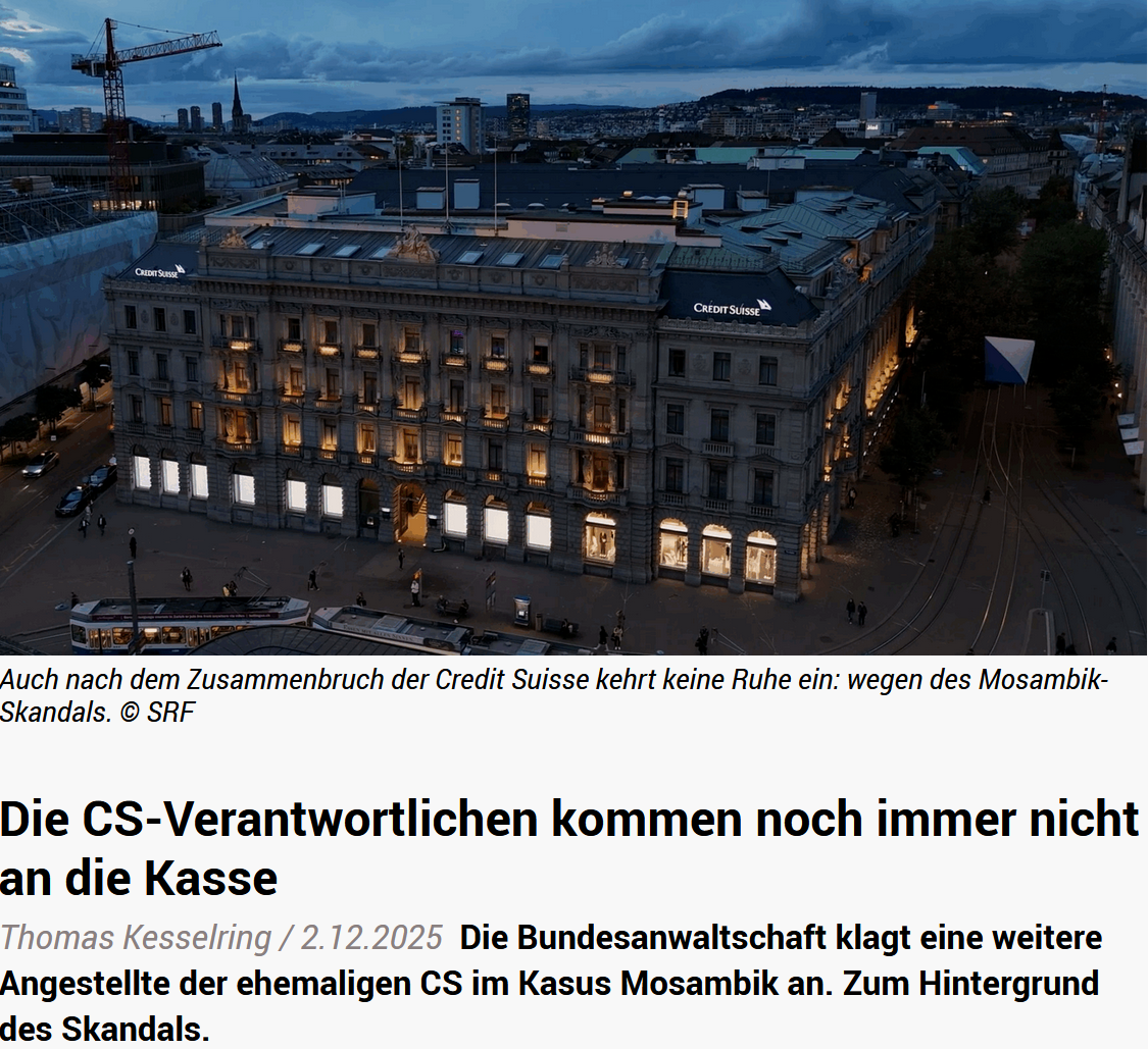 Am 1. Dezember 2025 hat die Bundesanwaltschaft nun Anklage erhoben: Sie richtet sich gegen eine ehemalige Compliance-Mitarbeiterin der Credit Suisse wegen des Verdachts der Geldwäscherei. Konkret geht es um rund 7.86 Millionen US-Dollar, die vom mosambikanischen Wirtschafts- und Finanzministerium an eine Firma überwiesen wurden, die mutmasslich in die Vorgänge verwickelt war. Die Zahlungen wurden als Gegenleistung für Dienstleistungen deklariert. Gemäss Anklageschrift handelt es sich jedoch wahrscheinlich um Bestechungsgelder. Der Credit Suisse und ihrer Nachfolgerin UBS wirft die Bundesanwaltschaft zudem vor, die mutmassliche Straftat aufgrund organisatorischer Mängel nicht verhindert zu haben.